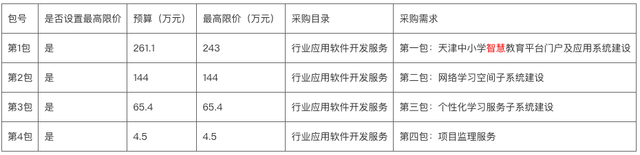 02 天津中小学智慧教育平台功能升级项目 项目编号:SCGP-2025-F-1013 项目投资:456.9万元 采购单位:天津市教育科学研究院 采购需求: 合同履行期限:自合同签订之日起2年服务期(特殊情况以合同为准)、 其他:本项目不接受联合体参与,本项目不接受进口产品 获取招标文件:于2025年11月18日到2025年11月25日,每天上午09:00至12:00,下午13:30至16:30(北京时间,法定节假日除外),在天津市政府采购中心网(http://tjgpc.zwfwb.tj.gov.cn)免费获取招标文件 投标截止时间:2025年12月09日09点30分(北京时间) 开标地点:天津市南开区红旗路208号乐谷商务中心A座10层 后台回复“天津中小学”获取项目联系方式